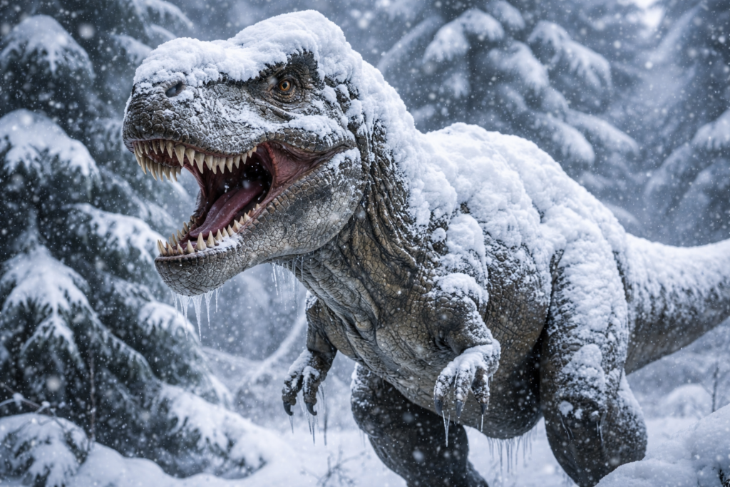 恐竜が絶滅の危機!?:福井県立恐竜博物館のティラノサウルスが大寒波で雪に埋もれ話題に
