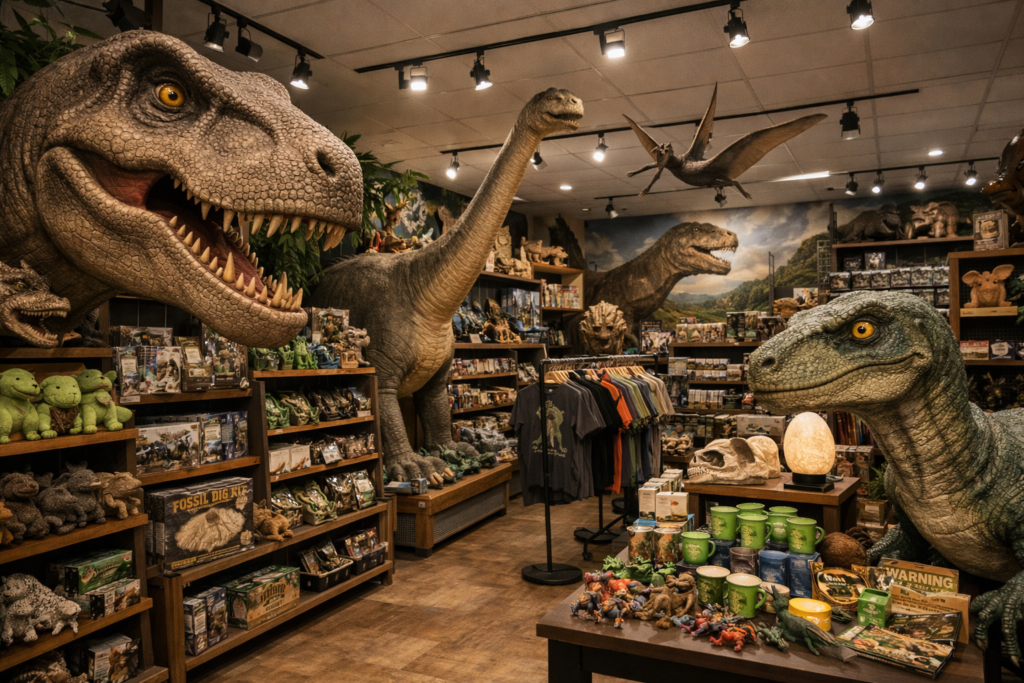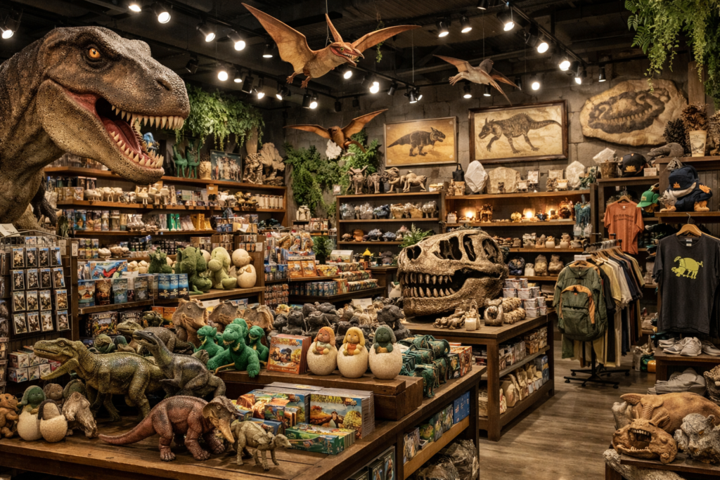 店内には、子供向けのかわいらしいぬいぐるみから、大人も楽しめる精巧な恐竜フィギュアまで幅広く展開。
